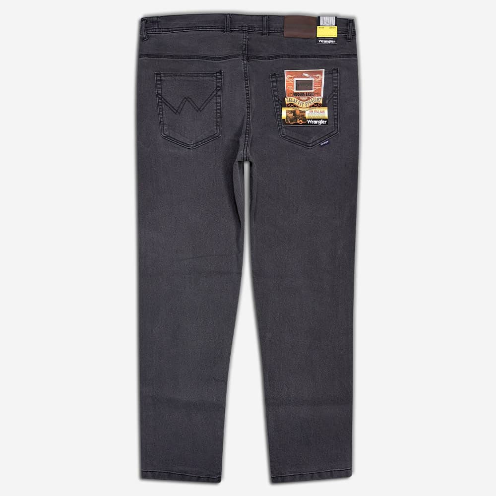 شلوار Wrangler سایز بزرگ دو جیب تخم مرغی جلو و دو جیب پاکتی در پشت دارد و روی شلوار هیچ طرحی نیست. فاق این شلوار با زیپ باز و بسته میشود و پارچه به کار رفته در آن خاصیت کشسانی ندارد.