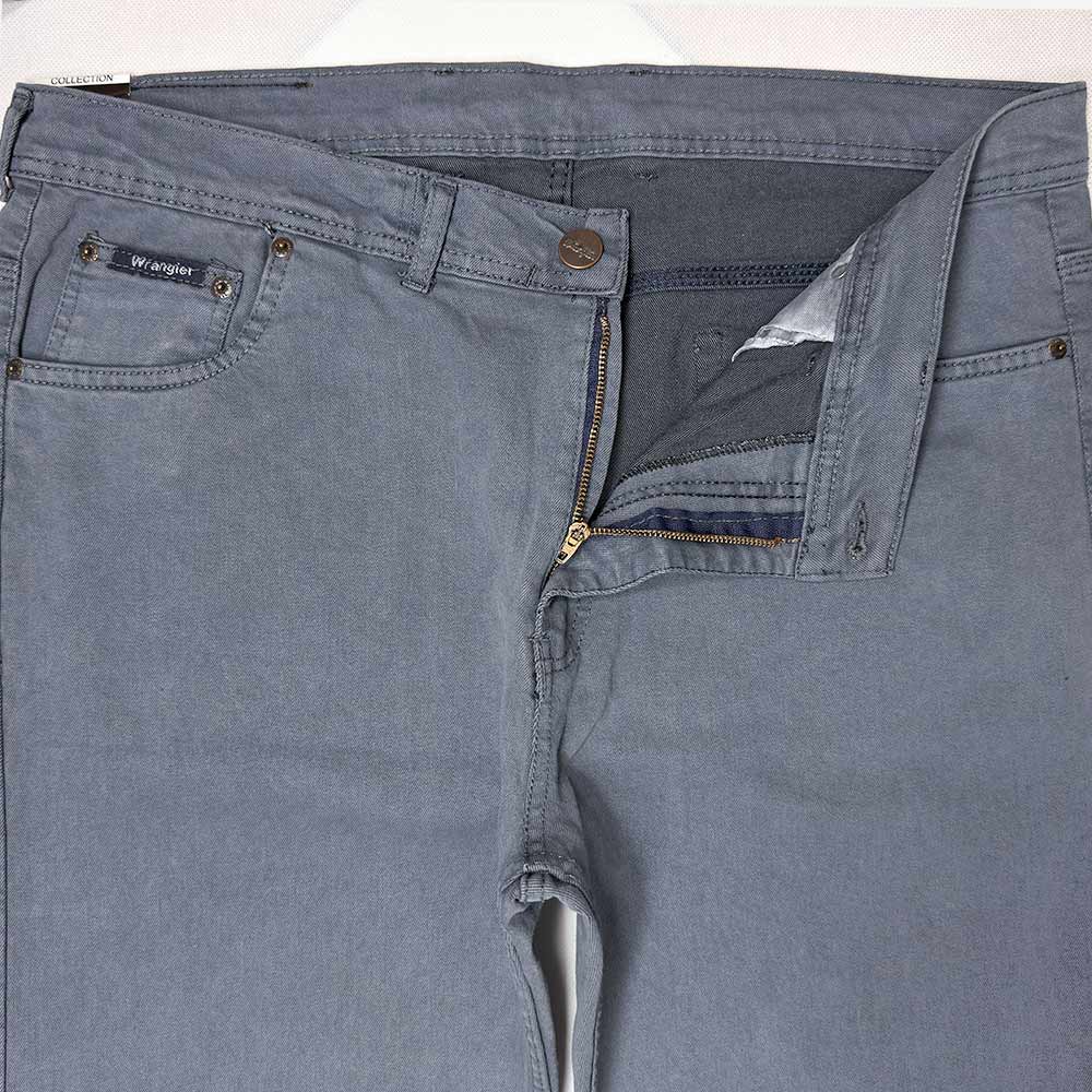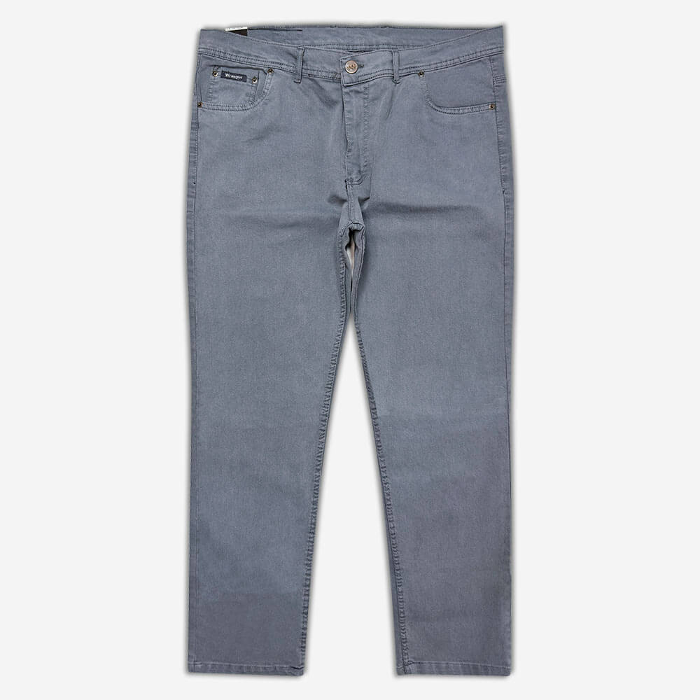 شلوار Wrangler سایز بزرگ دو جیب تخم مرغی جلو و دو جیب پاکتی در پشت دارد و روی شلوار هیچ طرحی نیست. فاق این شلوار با زیپ باز و بسته میشود و پارچه به کار رفته در آن خاصیت کشسانی ندارد.