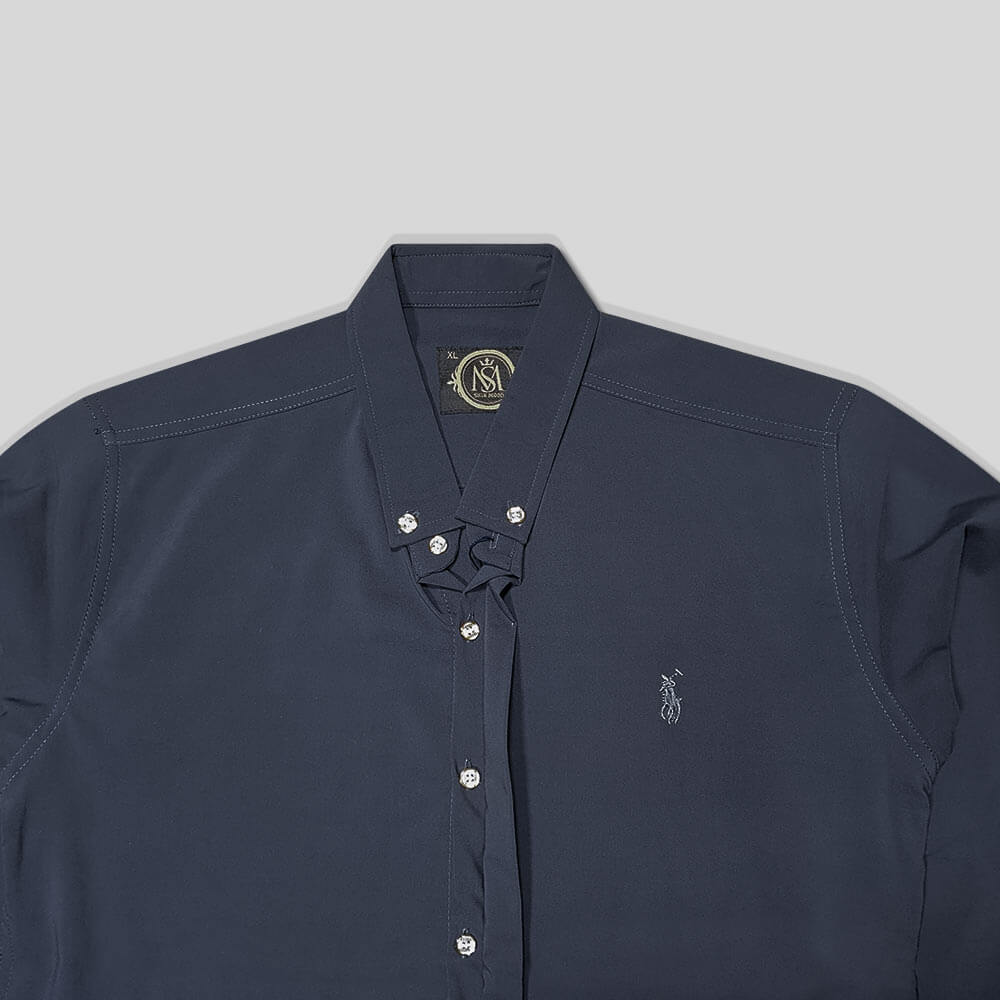 این پیراهن ساتن رامی ساده میباشد و فقط یک گلدوزی ساده روی سینه پیراهن دوخته شده است . یقه این پیراهن ساتن از نوع برگردان میباشد که با یک دکمه به بدنه پیراهن متصل میشود . بزرگترین ویژگی این پیراهن دکمه مخفی بودن آن است . پیراهن ساتن رامی دکمه مخفی در بین تمام پیراهن ساتن رامی ها پرطرفدار تر است زیرا مخفی بودن دکمه بسیار پیراهن شیک میکند . مخفی شدن دکمه به زیبایی پیراهن ساتن بسیار اضافه میکند زیرا پیراهن یک دست میشود و دکمه ها مشخص نیست . سر آستین این پیراهن ساتن رامی دارای دکمه است که میتوان از آن برای بالا زدن آستین و بستن سرآستین استفاده کرد.