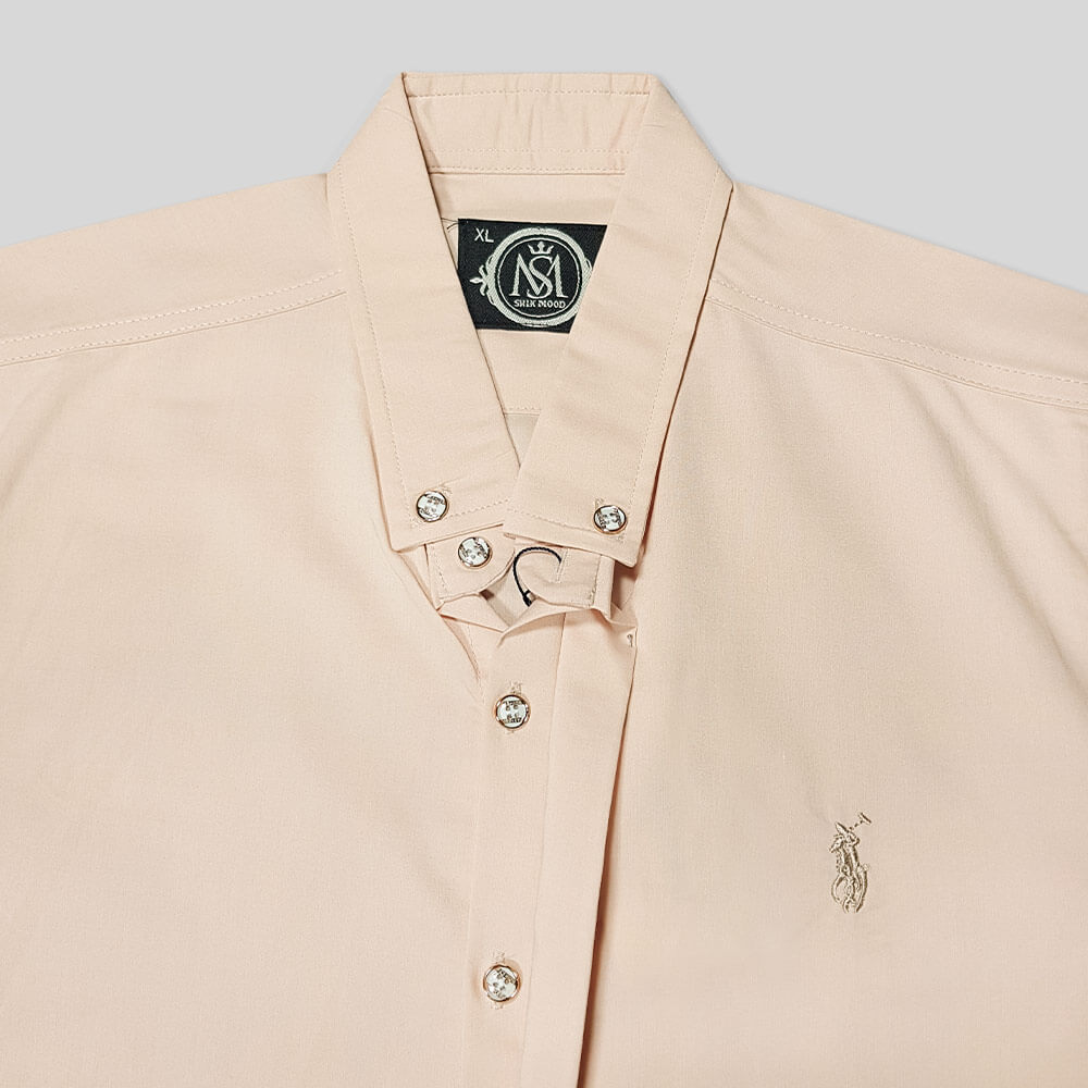 این پیراهن ساتن رامی ساده میباشد و فقط یک گلدوزی ساده روی سینه پیراهن دوخته شده است . یقه این پیراهن ساتن از نوع برگردان میباشد که با یک دکمه به بدنه پیراهن متصل میشود . بزرگترین ویژگی این پیراهن دکمه مخفی بودن آن است . پیراهن ساتن رامی دکمه مخفی در بین تمام پیراهن ساتن رامی ها پرطرفدار تر است زیرا مخفی بودن دکمه بسیار پیراهن شیک میکند . مخفی شدن دکمه به زیبایی پیراهن ساتن بسیار اضافه میکند زیرا پیراهن یک دست میشود و دکمه ها مشخص نیست . سر آستین این پیراهن ساتن رامی دارای دکمه است که میتوان از آن برای بالا زدن آستین و بستن سرآستین استفاده کرد.